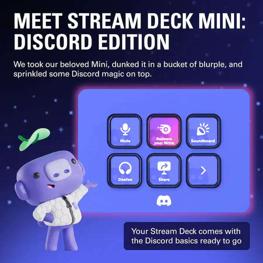 Meet the Elgato Stream Deck Mini – Discord Edition, the ultimate companion for Discord power users. With six fully 1. 2. 3. 4. 5. 6. 7. 8. 9. 10. customizable LCD keys and preloaded Discord actions, you can mute, deafen, screen share, and switch chats in a single tap. Wrapped in Discord’s iconic blurple and bundled with a free 1-month Discord Nitro voucher, this Stream Deck Mini goes beyond voice and chat. Whether you’re in-game, live streaming, or just hanging with friends, it lets you move fast, stay organized, and express yourself with ease. Plug it in, power up, and take control—because it’s your deck, your rules.